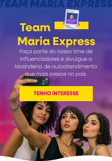 Ao ser um membro do Team Maria Express você vai representar uma marca que acredita no bem-estar, na praticidade e no cuidado com o que realmente importa. Mais do que uma lavanderia de autoatendimento, a Maria Express é uma aliada na rotina de quem busca praticidade sem abrir mão da qualidade.